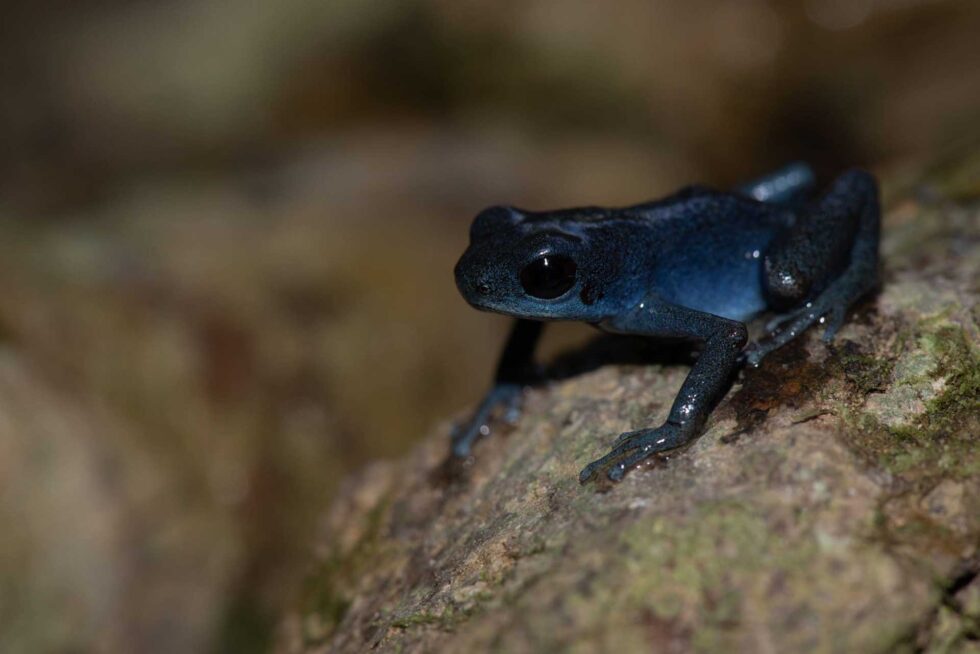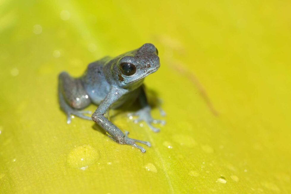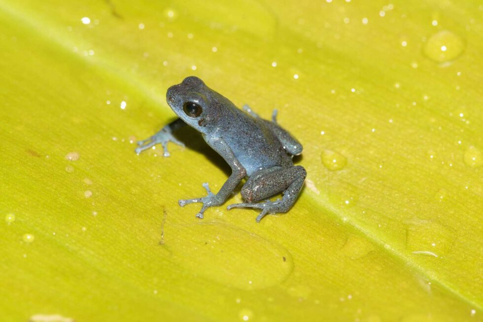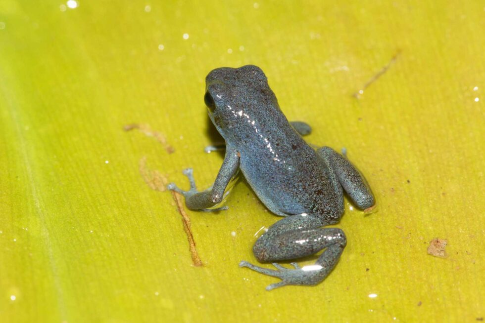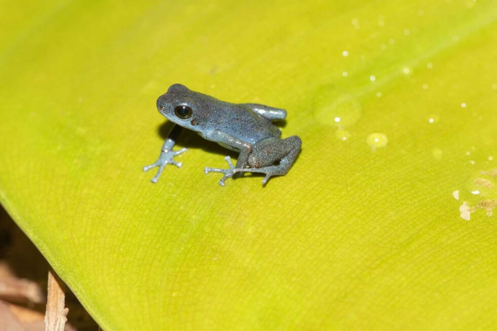 Nachdem es dem Team gelungen war, ein degradiertes Gebiet zu erreichen, das zum Teil als Garten genutzt wurde, entdeckten wir sofort ein paar Exemplare von Dendrobates auratus, die nur wenige Meter vom Ufer entfernt einen steilen Pfad entlang hüpften. Dieser grün-schwarze Pfeilgiftfrosch ist hier besonders häufig anzutreffen, vor allem auf degradierten Flächen. An einer Stelle entlang eines gut ausgebauten Weges konnten wir neun Tiere auf einmal beobachten. Dendrobates auratus aus dieser Region ist als Karibik-Morphe bekannt und ist von allen bekannten Formen tatsächlich die am weitesten verbreitete. Sie kommt entlang der Karibikküste vom Südosten Nicaraguas bis in den Westen Panamas in der Provinz Bocas del Toro vor. Die Muster bestehen aus großen Flecken und Bändern von grün bis türkisgrün auf schwarzem Grund. Hierbei handelt es sich um eine der größeren Morphen, die viel größer ist als Ophaga pumilio, welche in einigen Gebieten sympatrisch vorkommt. Die Weibchen sind etwas größer, während die Männchen in der Regel etwas schlanker sind und verbreiterte Fingerspitzen aufweisen.