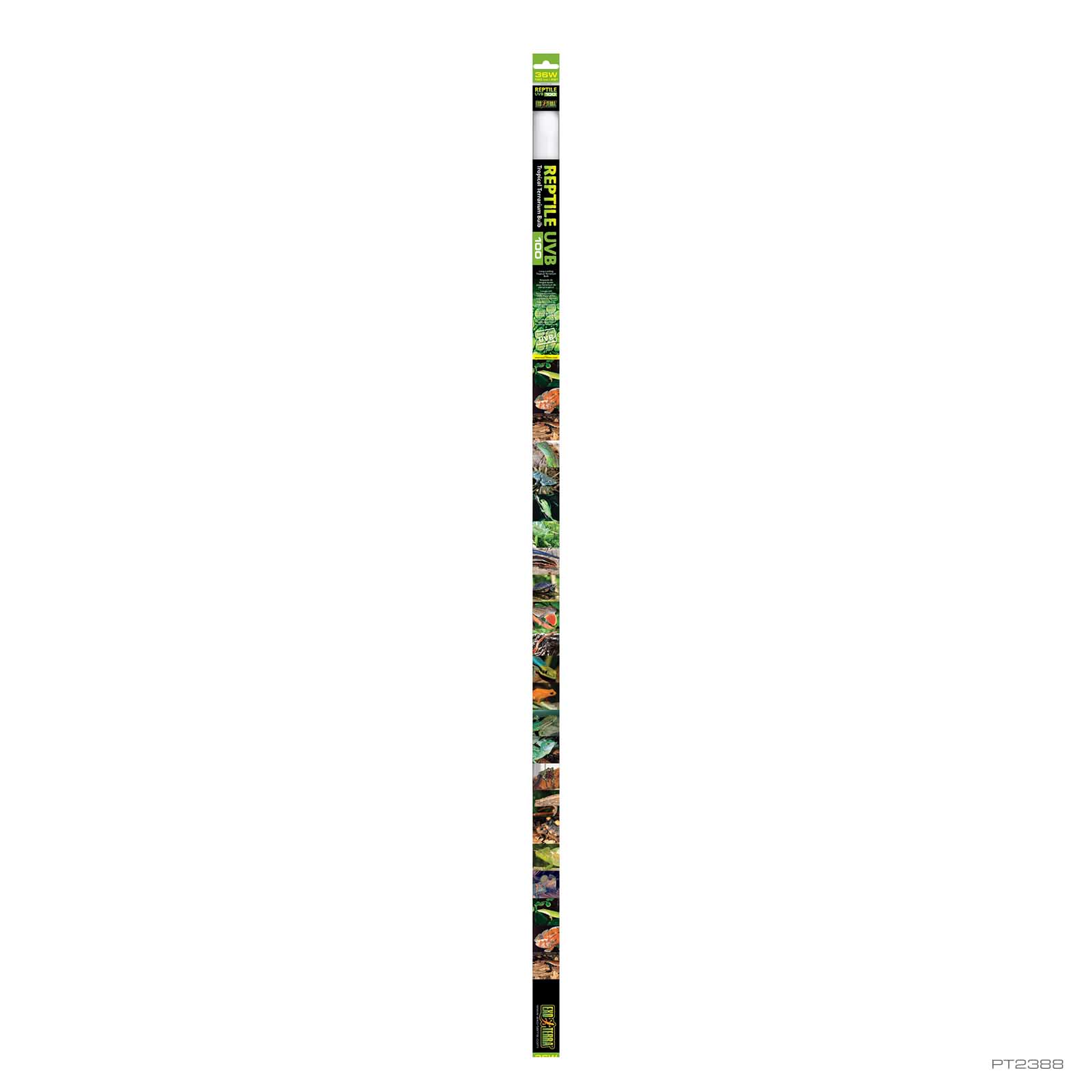 Die Exo Terra Reptile UVB100 strahlt optimale Mengen an UVB aus; ähnlich den Bedingungen in schattigen Umgebungen wie z.B. in Regenwäldern oder an anderen tropischen Plätzen. Die in diesen Lebensräumen beheimateten Reptilien erhalten aufgrund der klimatologischen Bedingungen (ziemlich hohe Luftfeuchtigkeit, Wetteränderungen, etc.) moderate Mengen an UV-Strahlung. So wird verhindert, dass ungefiltertes Sonnenlicht auf die sich sonnenden Reptilien trifft. Der optimale Vitamin-D3-Nutzenindex gewährleistet die Vitamin-D3-Photosynthese, die zur Kalziumabsorbierung beiträgt und vor Knochenerweichungen schützt.