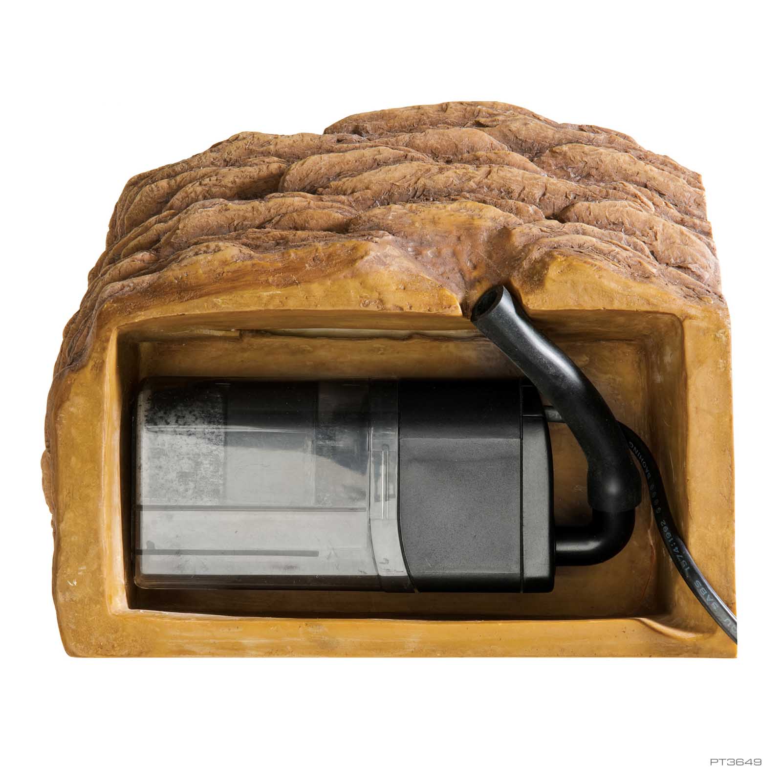 El Exo Terra Turtle Cliff está equipado con un Filtro para Terrario Repti Clear, un sistema óptimo de filtración del agua con un gran volumen de filtración y un control eficaz del flujo. El sistema de filtración de 3 etapas permite la sustitución alterna para una actividad filtrante biológica continua, garantizando una filtración mecánica, química y biológica óptima. Se puede añadir material filtrante adicional a las cámaras para aumentar el rendimiento del filtro. Los calentadores acuáticos también pueden ocultarse dentro del Exo Terra Turtle Cliff.