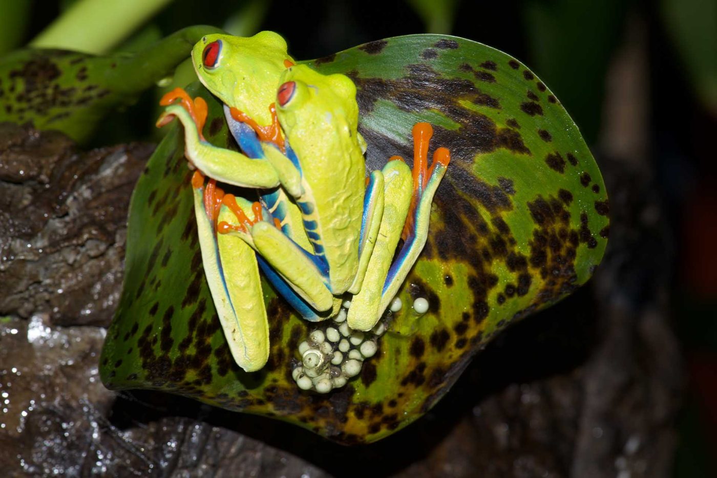 The breeding season of Red-Eyed Tree Frogs usually occurs during the rainy season, mostly between May up to November. The peak mating frequency occurs mainly in June, with a second peak in October. At nighttime during the breeding season, males conduct quivering motions and continuously perform their mating call to attract the females.