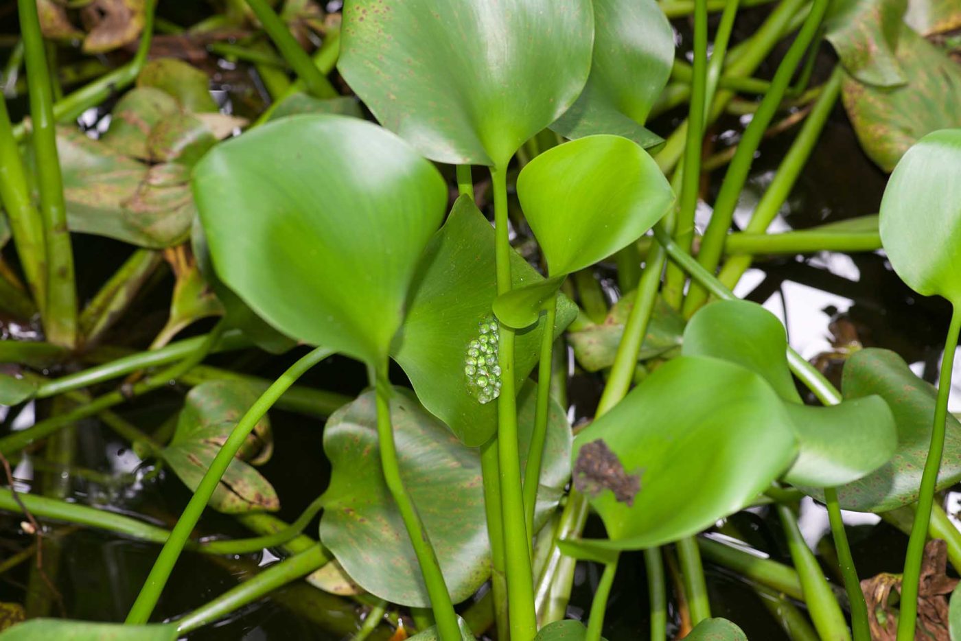 After about a week, the eggs are ready to hatch and the tiny tadpoles will start to wriggle themselves free from the gelatinous mass. Since all the egg clutches are attached to leaves overhanging the water, the hatching tadpoles simply drop into the water underneath and remain motionless for several days.