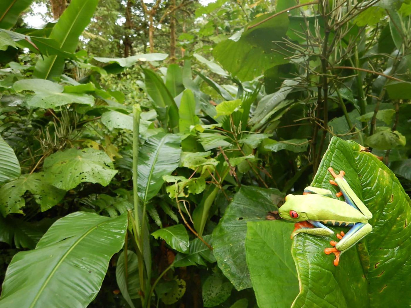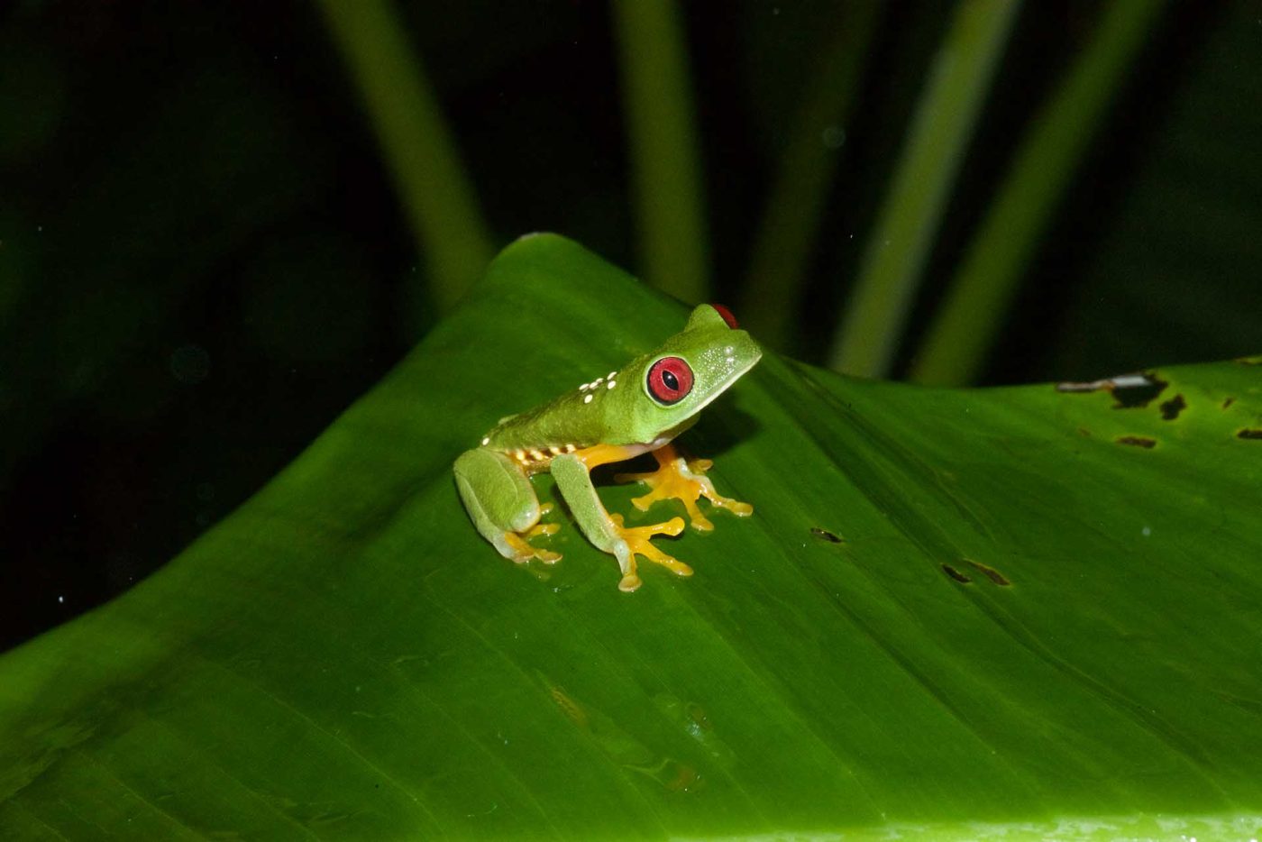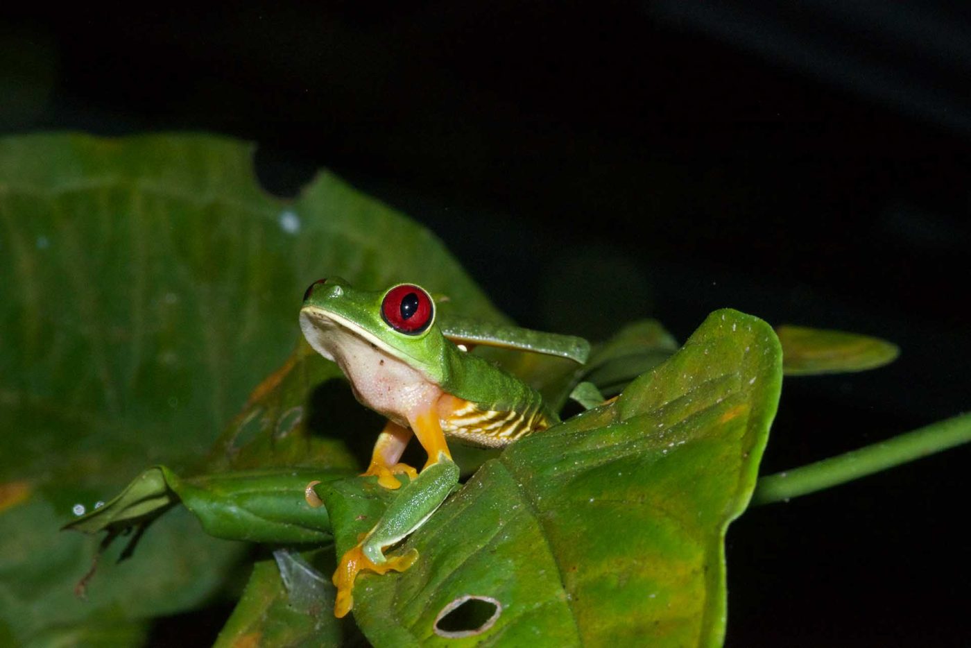 Red-Eyed Tree Frogs are both crepuscular and nocturnal, they sleep on the back of larger leaves in the shrubs during daytime and start foraging the shrubs at night to feed on insects.