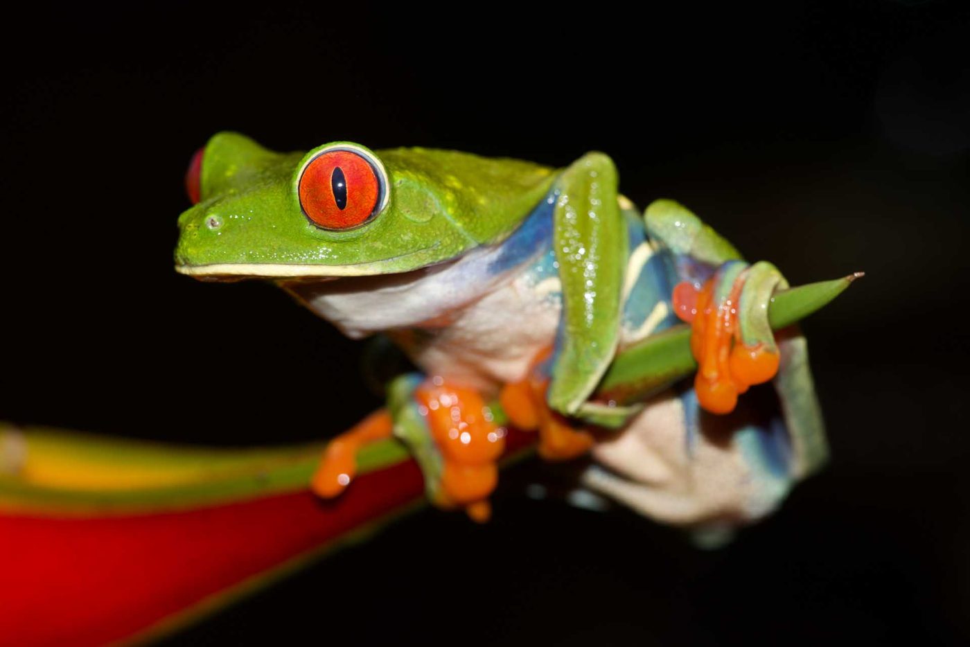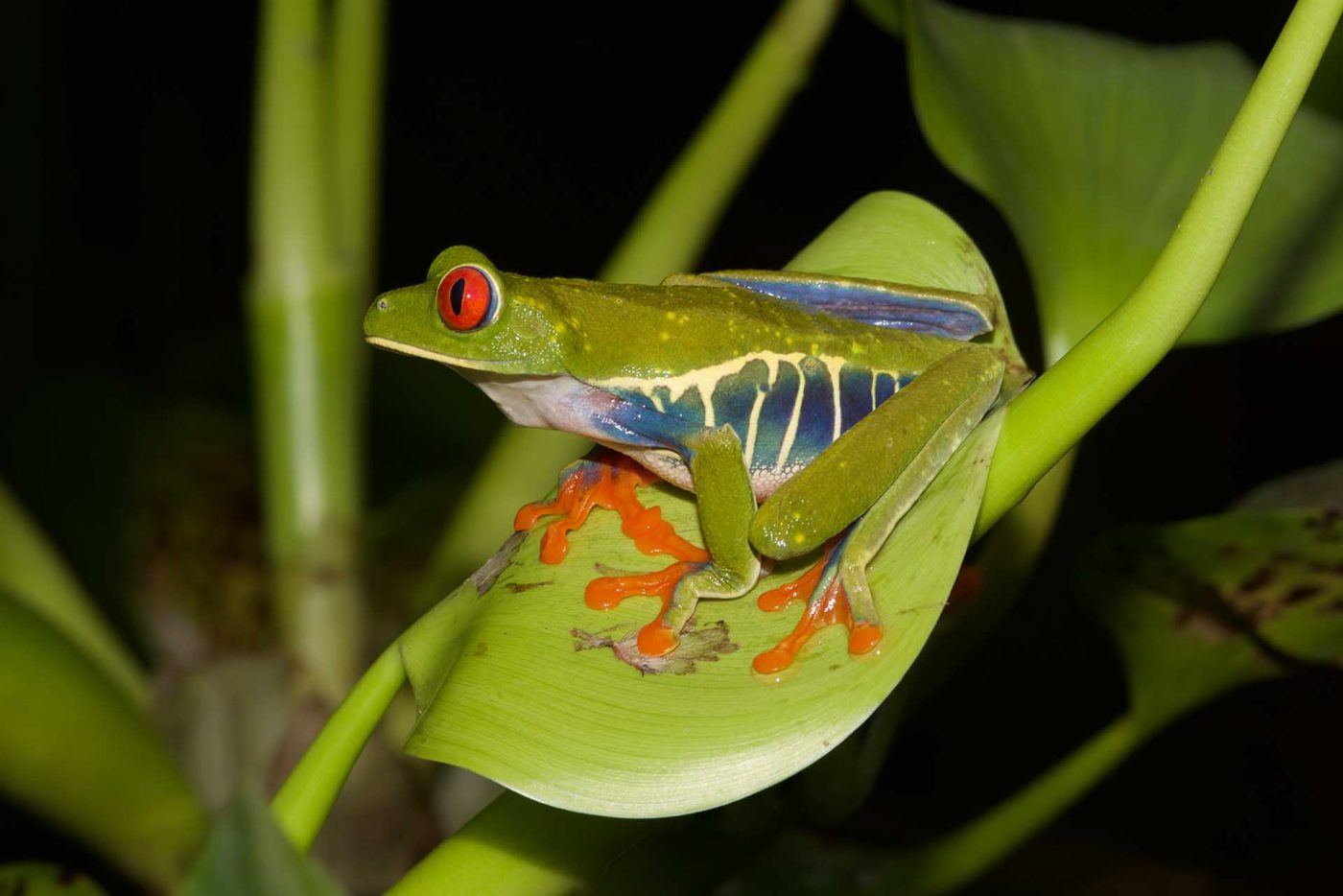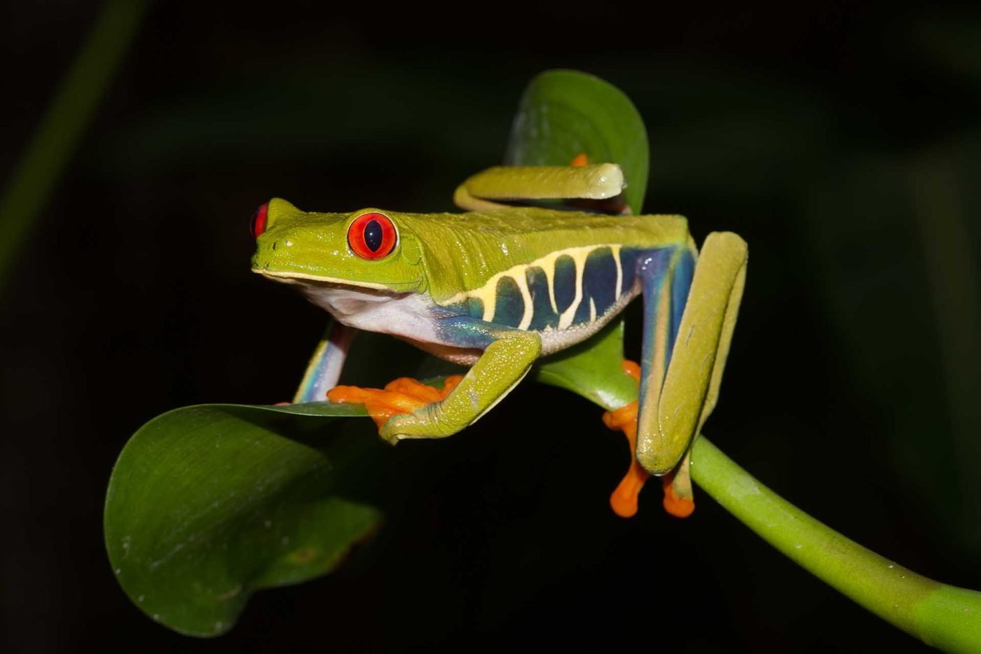 Red-Eyed Tree Frogs are slender, colorful, arboreal frogs. The frog's smooth skin consists of a bright green coloration, while the flanks show blue and cream white bars. Their partially webbed feet and toe pads are a stunning orange. Their big round eyes are bright red and have vertical pupils, typical for members of the Phyllomedusinae subfamily. With this extensive palette of colors and its graceful physique, this frog certainly belongs in the top ranking of the most beautiful tree frogs in the world.