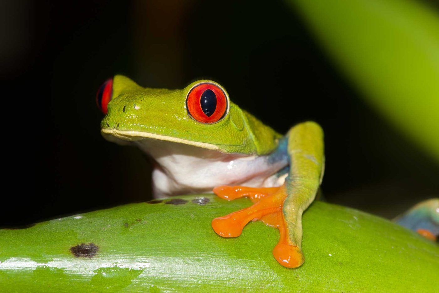 When at sleep during the day, the frog doesn't have to completely close its eyelids, but instead can rely on its translucent, nictitating or blinking eyelids to keep the eyes from dehydrating. These translucent eyelids show a very fine gold vein-like mesh, which allows the frog to keep "a keen eye" on potential predators, without the need to open its actual eyelids. But once disturbed in his sleep by a potential predator, the frog rapidly opens its flashy red eyes, show its striking blue sides and orange feet in order to confuse the predator for a few seconds... enough to leap into the air and disappear into the shrubs.