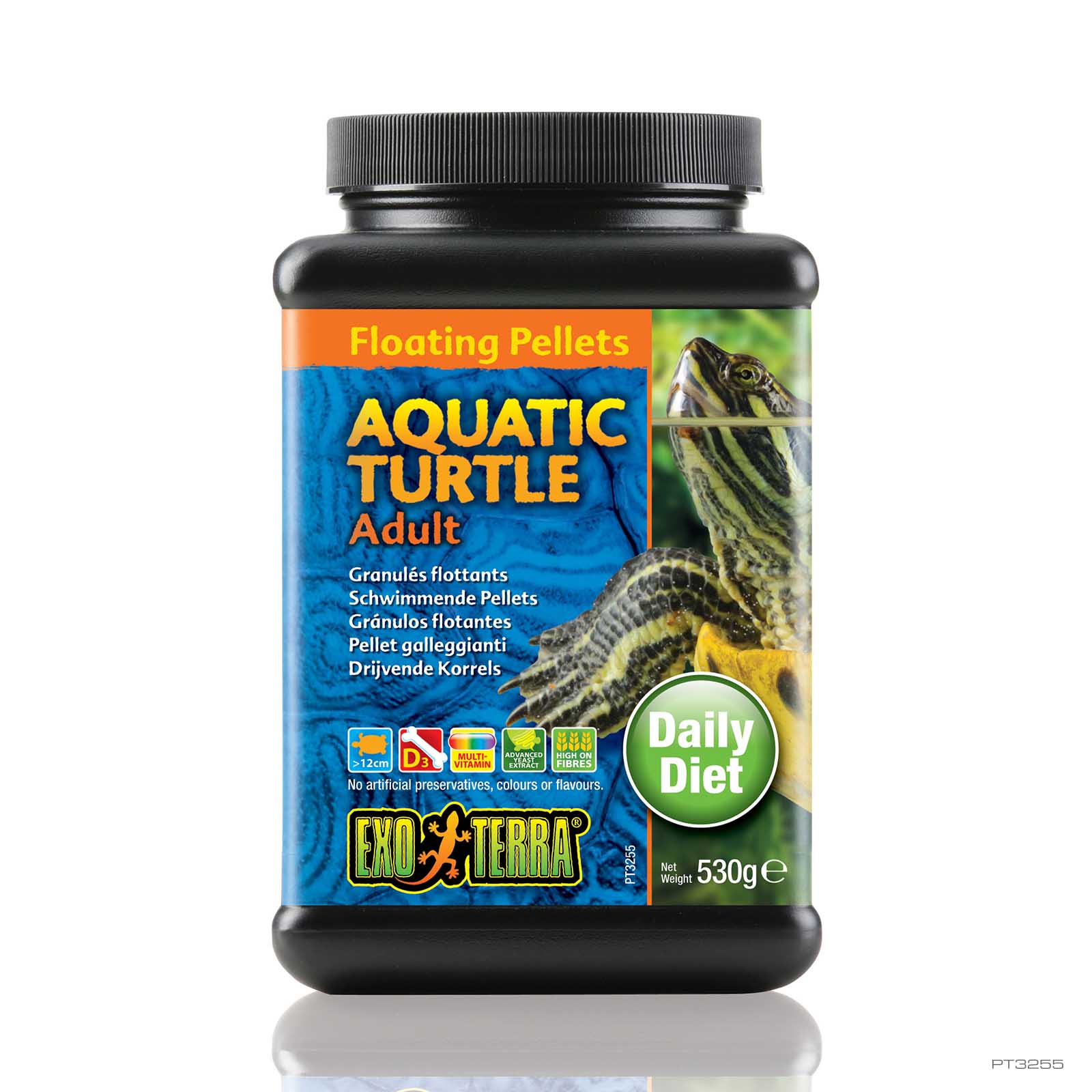 Les granulés flottants Exo Terra pour tortues aquatiques sont un aliment nutritif enrichi de gammares, minéraux, multivitamines. Les granulés Exo Terra pour tortues aquatiques fournissent à toutes les tortues aquatiques et semi-aquatiques adultes une source riche en nutriments y compris des vitamines, du calcium (de multiples sources), des protéines de qualité et bien plus. Ces granulés extrudés flottants de haute qualité aident les tortues à conserver une carapace dure grâce à des sources naturelles et enrichies de calcium. La vitamine D3 est incluse et essentielle pour assurer l’absorption adéquate de calcium. Ces granulés flottants extrêmement savoureux fournissent une alimentation de qualité. L’aliment Exo Terra pour tortues aquatiques inclut un « extrait supérieur de levure » pour le bien-être à long terme des tortues; cet extrait aide à soutenir un appareil digestif sain.